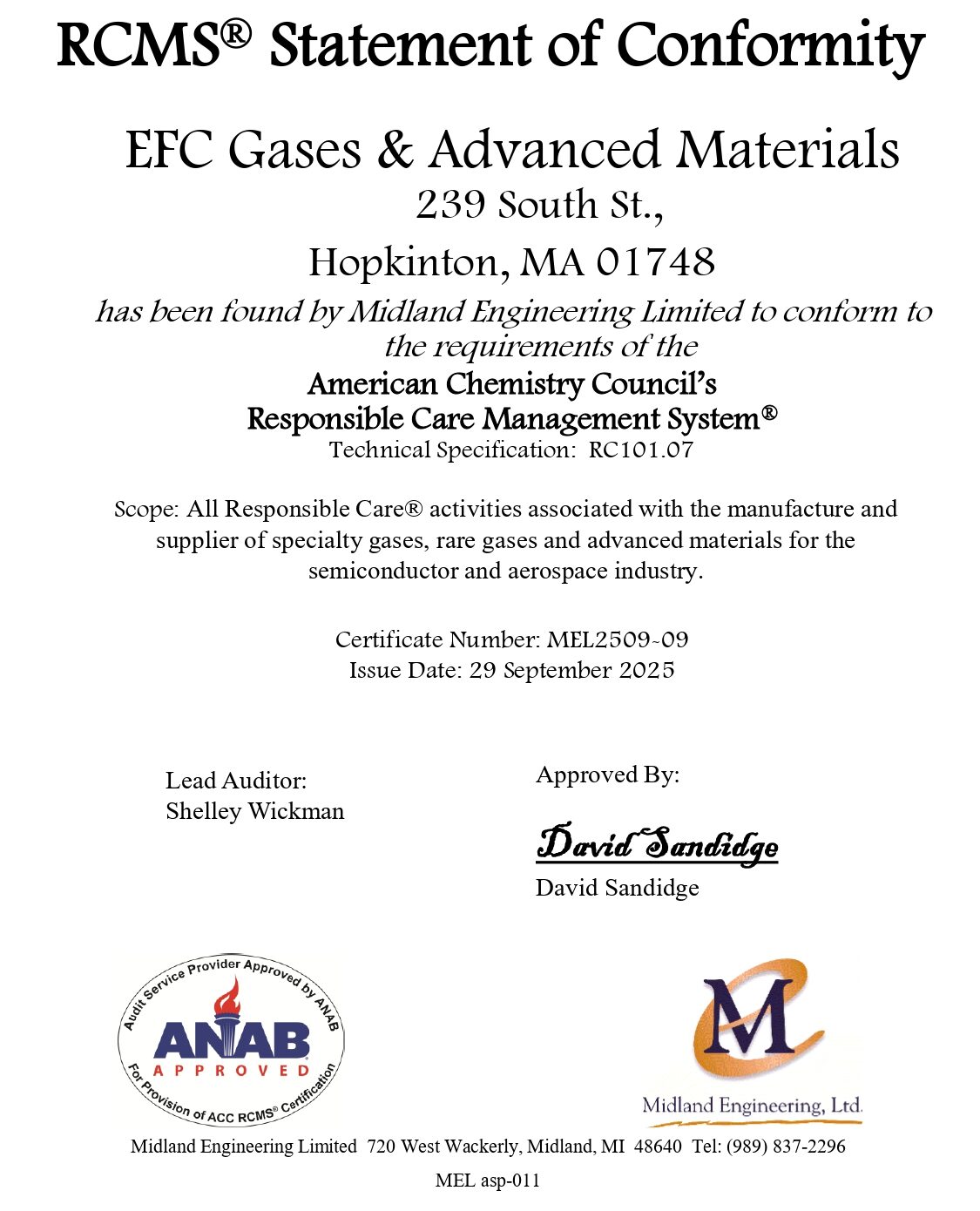 EFC Gases & Advanced Materials, a recognized leader in high-purity gases and chemical precursors for the semiconductor, aerospace, and advanced technology industries, today announced certification under the American Chemistry Council’s Responsible Care® program, the industry’s leading initiative for advancing environmental, health, safety, and sustainability (EHS&S) standards.